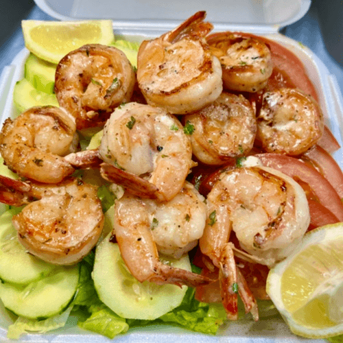 10pc of Grilled Garlic Butter Jumbo Shrimp set over a bed of Garden Salad with Dressing of your Choice on the side (Ranch or Italian Available)